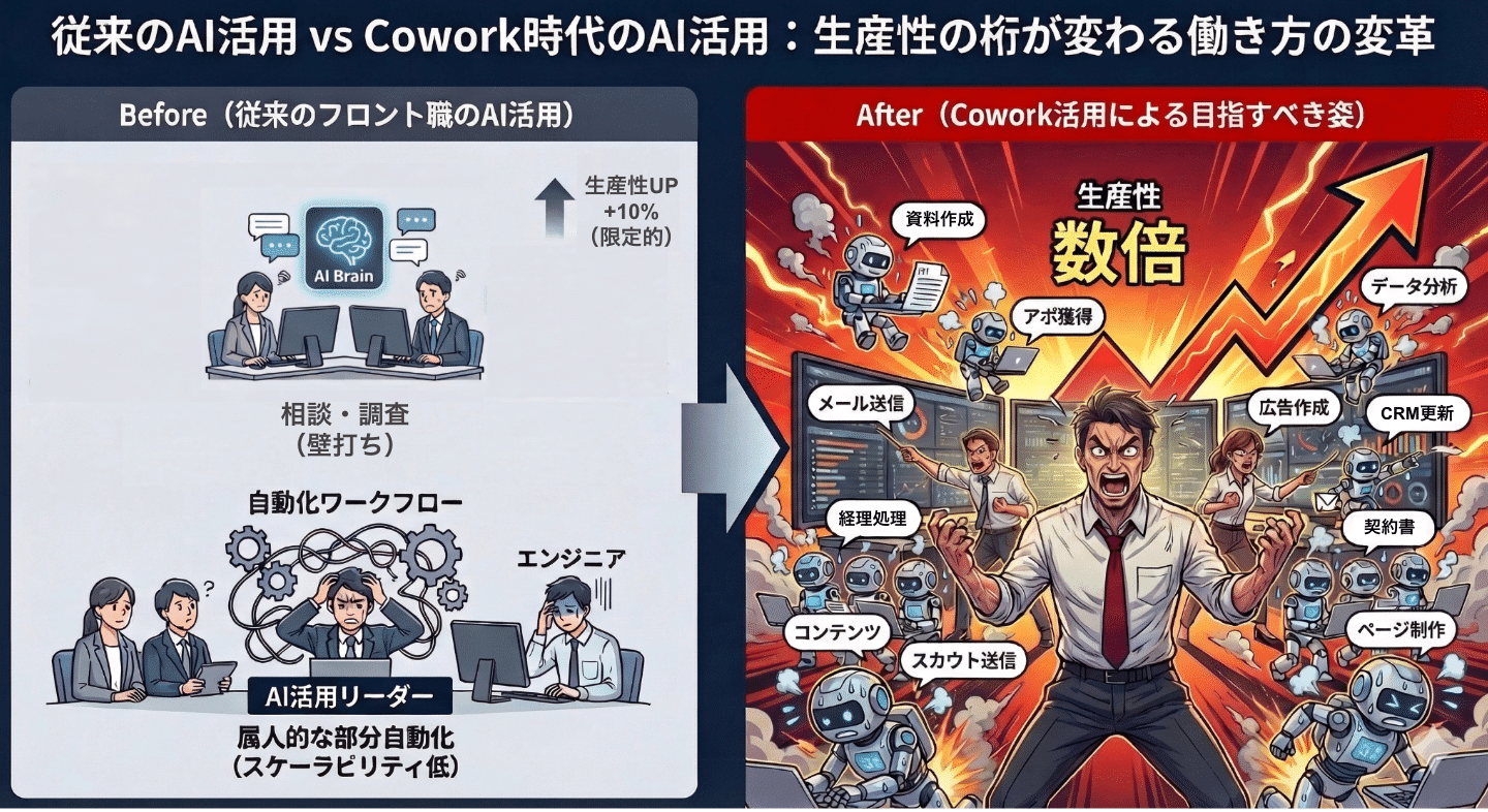 Claude Coworkのような汎用AIエージェントを用いれば、あらゆる業務にAIを活用できます。「ちょっとやってみて、うまくいったらスキル化する」とやれば、業務を止めず、毎日走りながら生産性を上げられます。
