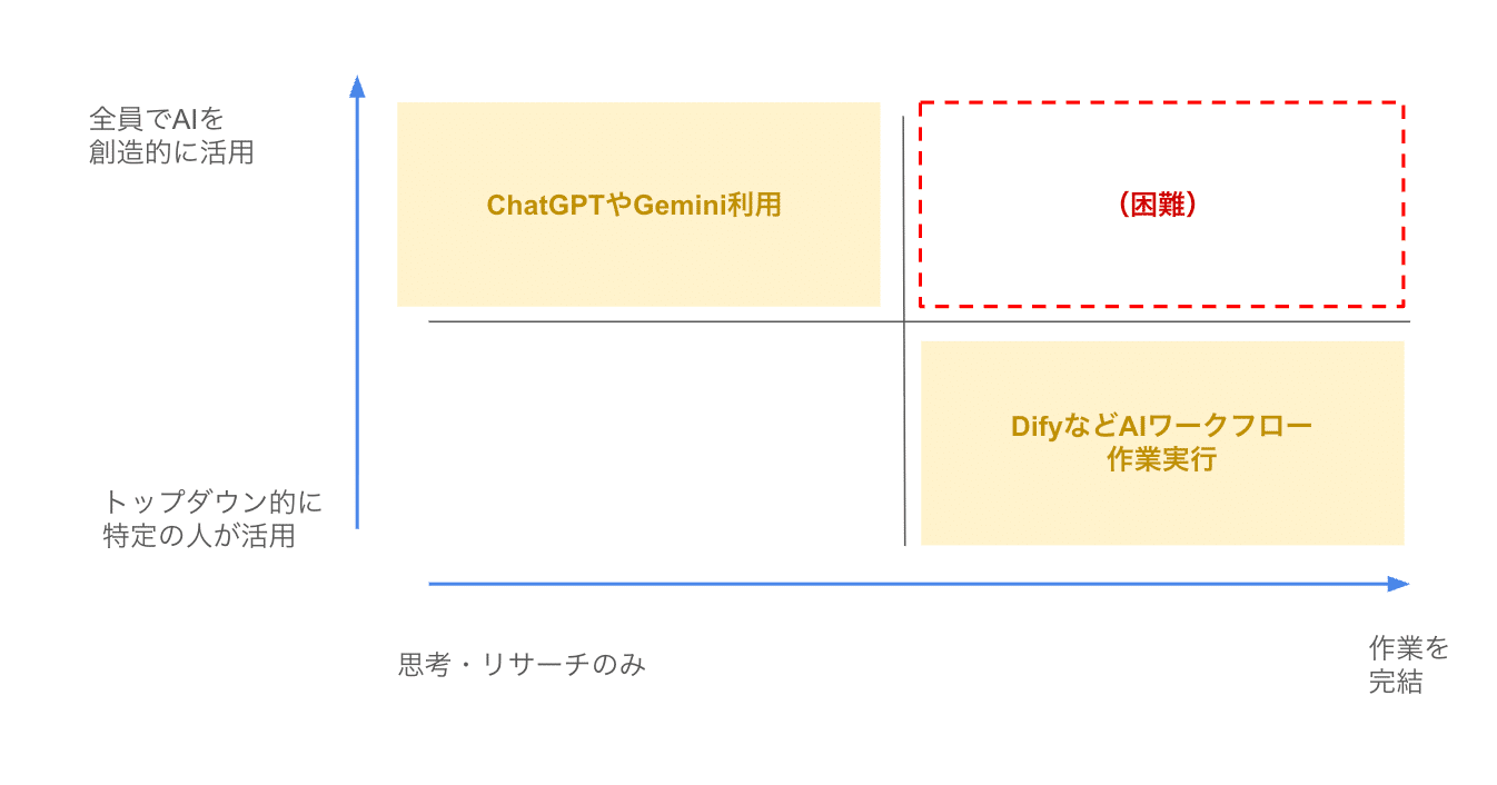 一方、こうしたAI活用の問題点は、特定の「AI活用リーダー」にAIワークフロー構築など負荷が集中し、スケールしづらいことです。実際に、他部署のエンジニアのリソースを消費するケースも少なくありません。