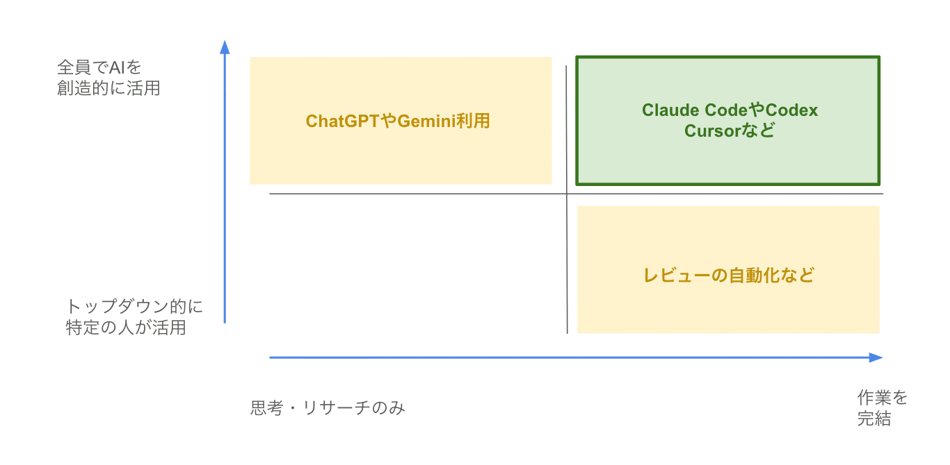 エンジニアの業務では、誰か一人の人がAI活用を推進するわけではありません。逆に、思考やリサーチだけをAIに依頼して自分でコードを書くわけでもありません。