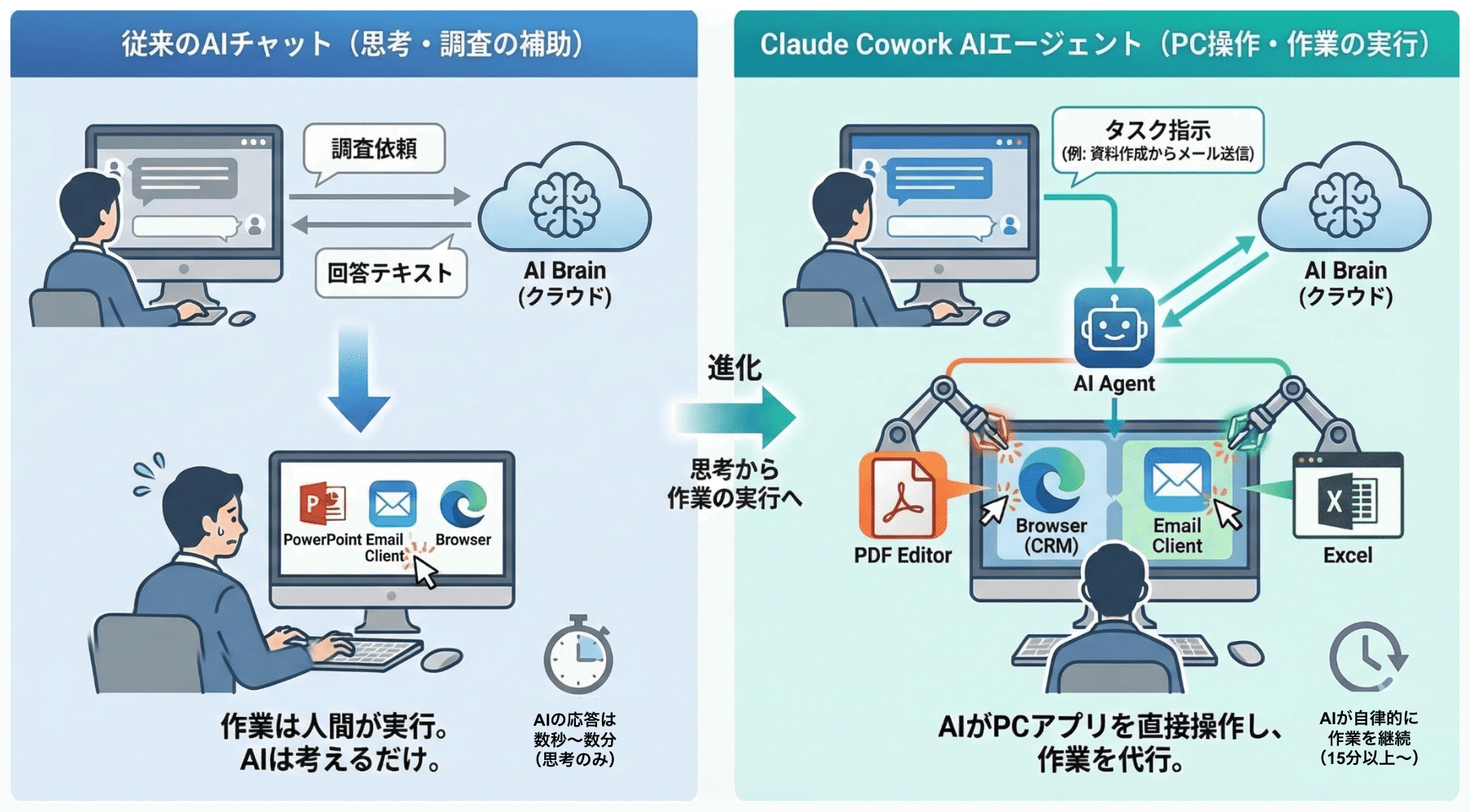 一方で、AIエージェントツールは、PC上で動くことで多くの汎用的な作業ができるのが革命的です。Claude Coworkも、アプリとしてダウンロードしたClaude Desktop上で使えます。これにより、大量のファイルから契約書の雛形を探してきたり、ブラウザからSaaSを操作するといったことが可能です。