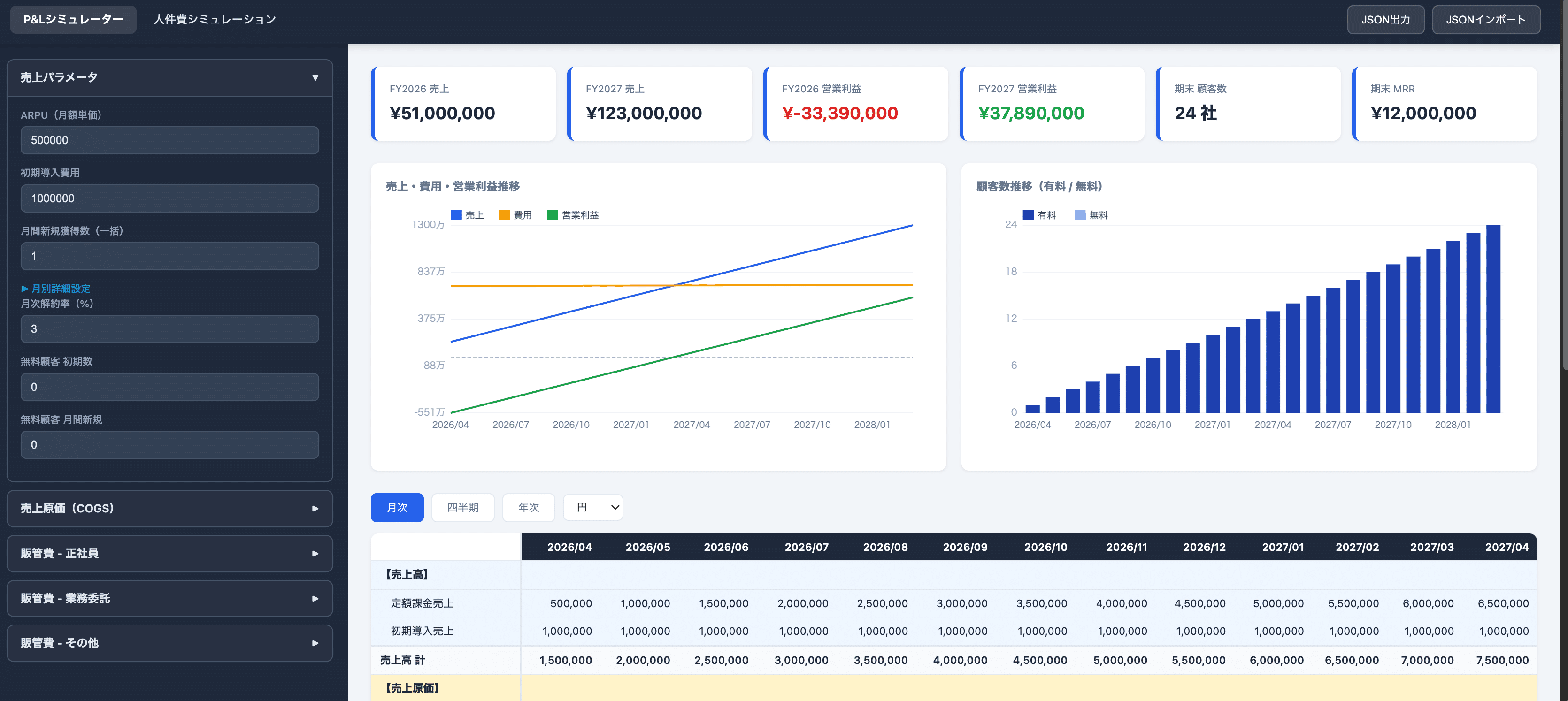 月額単価(ARPU)、初期導入費用、新規獲得数、解約率を入力 → 24ヶ月分のP&Lが自動生成