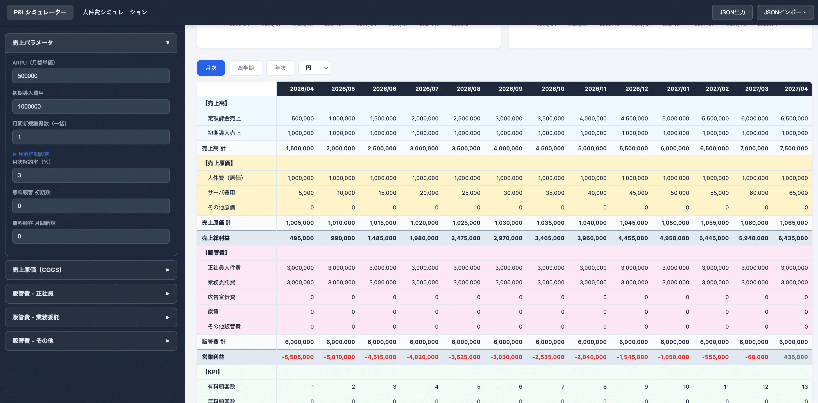 2026年4月〜2028年3月(2年間・24ヶ月)の月次P&Lをシミュレーションするツールです。