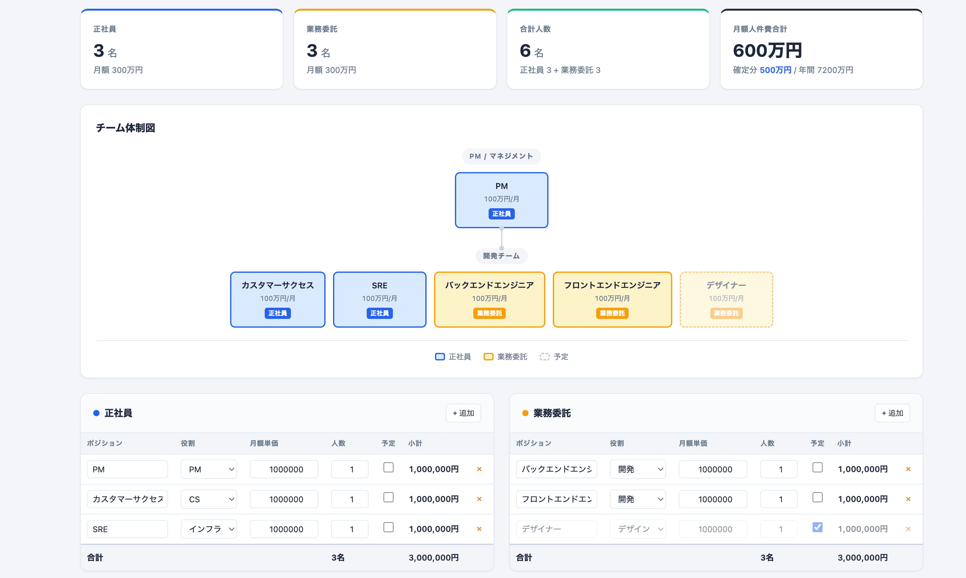 正社員: ポジション別に管理(ポジション名・月額単価・人数・開始月・終了月を個別設定)。複数追加・削除可能