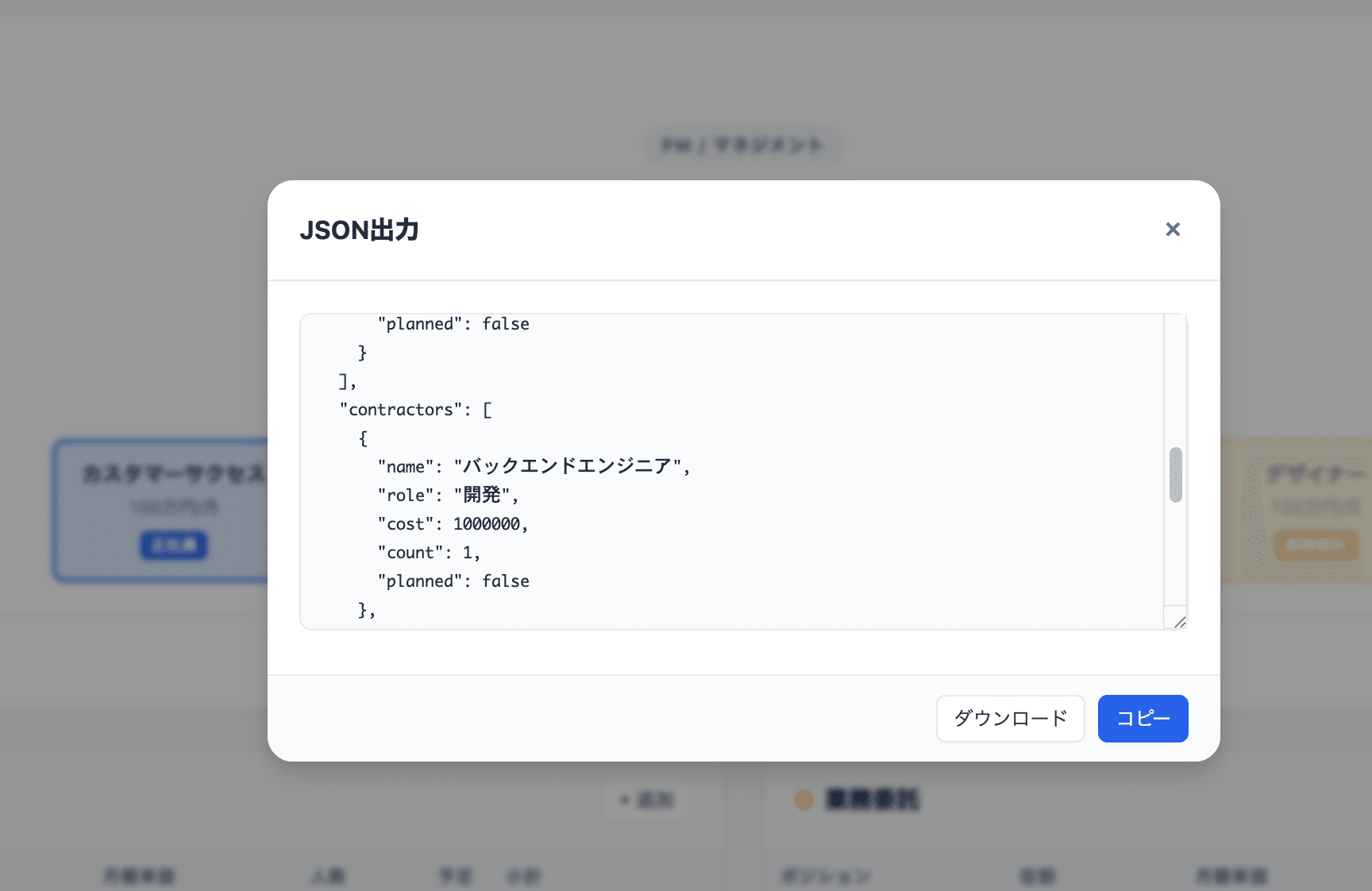 JSON出力: モーダルにJSONを表示。コピーボタンとダウンロードボタン付き
