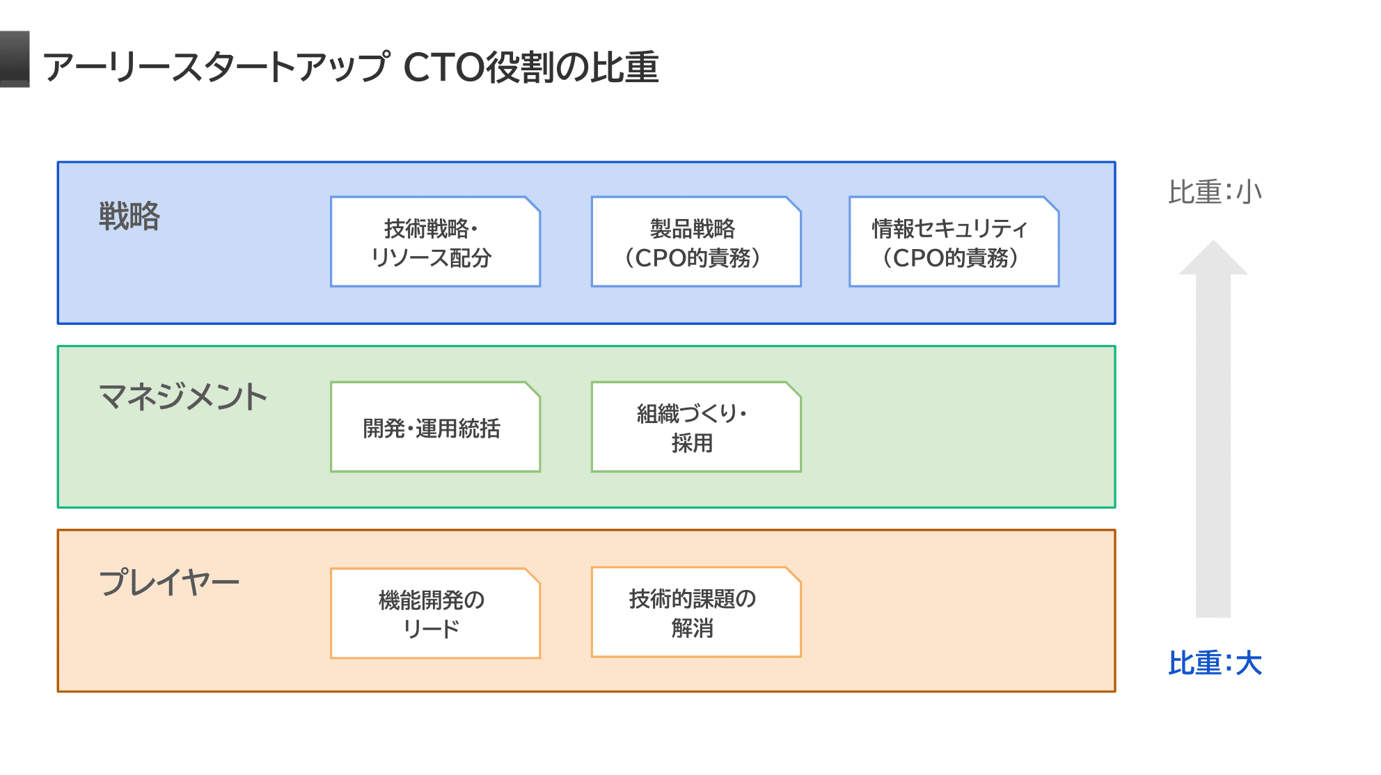 ゆえにアーリーフェーズにおいては、たとえCTOを採用したとしても、実際には「経営者として戦略を立案・実行する」という役割の比重は小さく、コードを書く・開発を直接マネジメントするといった比重が大きくなるケースが多いです。