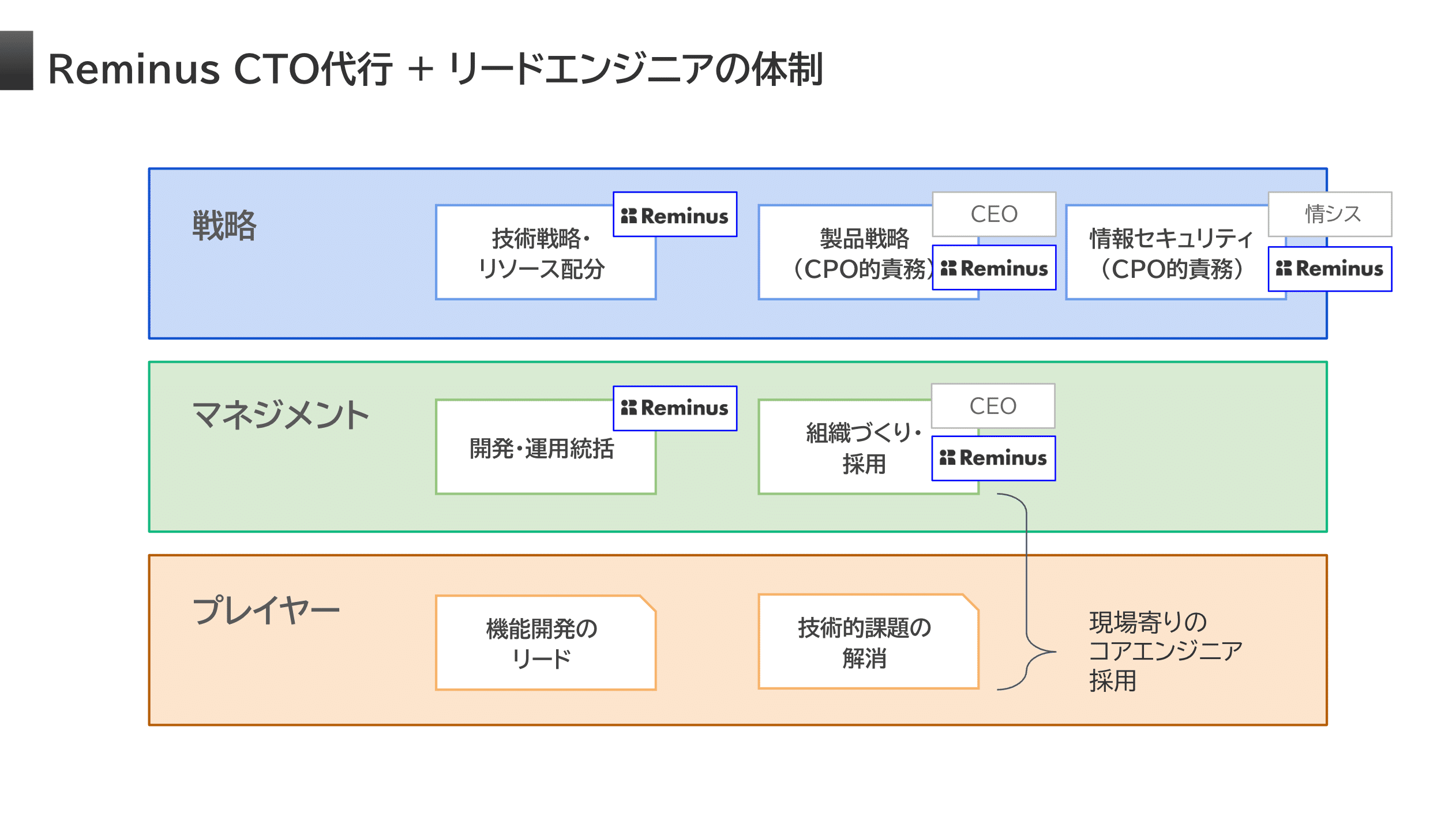 例えば、「CTO採用がうまく進まない」という状況でリードエンジニアが採用できそうな状況であれば、その方を採用して現場で力を発揮してもらい、技術戦略やマネジメントをReminusが担うことで、バランスよく回る組織を作ることができます。